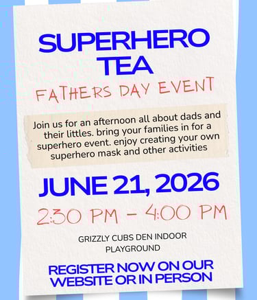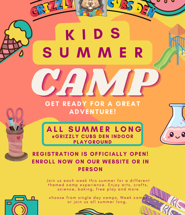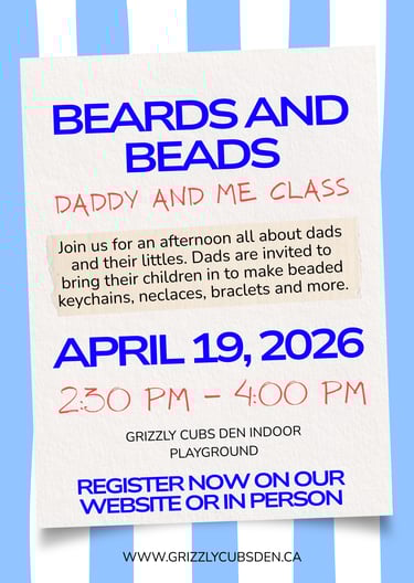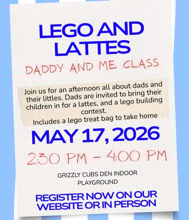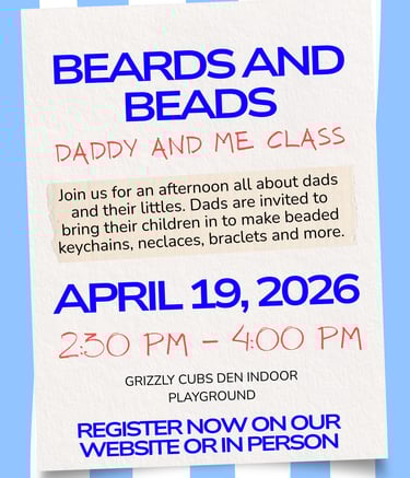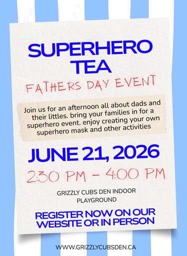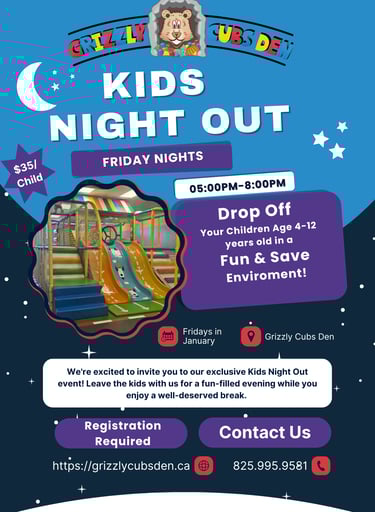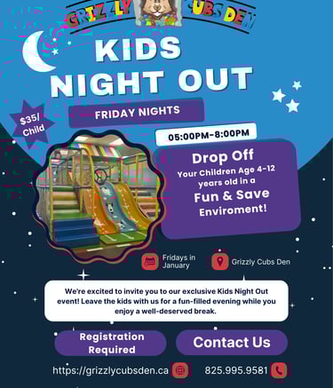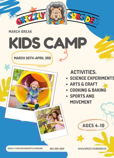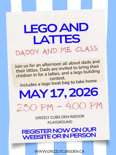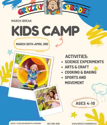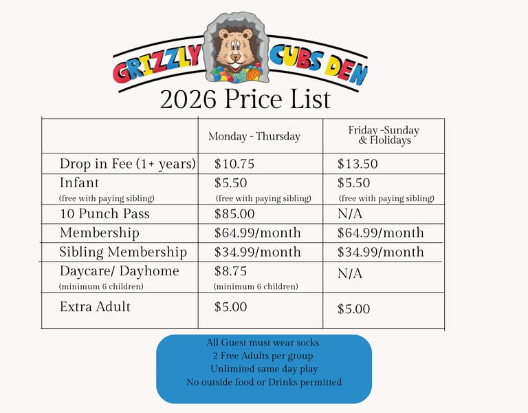 Grizzly Cubs Den most exciting indoor playground in town with various elements for the whole family including a Climbing structure, play house, Classes, Arcade games and more. NOW Open 6 days a week! offering drop-in play, classes, Birthday, Christmas, and any other party space rental you may need..